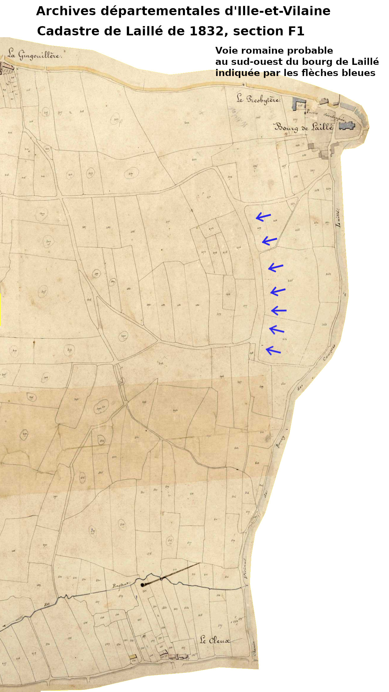 Passé la rivière Hodeillé plus aucune trace, sinon au nord de la Gripay où Bizeul signale un fragment de 200m se dirigeant vers la forêt de Bas-Gourdel ou "Traviguel" [1, p. 47]. Au sud de cette même forêt, le CERAPAR signale qu' "un curage de fossé fait apparaître un bombé jaune-orange sur un fond gris, il peut correspondre à l'ancienne voie" [15, p. 8]. Bizeul ne distingue plus rien après et suppose que la voie peut passer entre les fermes Fresnais et Bas-Gourdel [1, p. 47]. Plus au nord on a conservé la tradition qu'un Grand Chemin qui passerait à l'ouest et tout près bourg de Laillé et suivrait peut-être à l'est de la clôture du parc du Château de Laillé [1, p. 47].